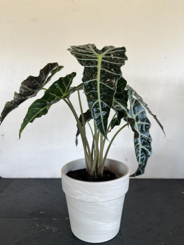 Alocasia 'Polly' is the mysterious forest queen of the houseplant world. Her arrowhead-shaped leaves are a deep, almost black green—etched with sharp, silvery-white veins that look like lightning in the night sky. She's compact, sculptural, and seriously stunning.