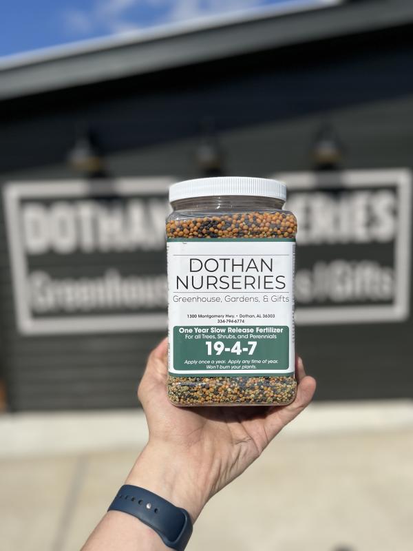 Dothan Nurseries One Year Fertilizer is like a personal trainer for all your plants! It works on all trees, shrubs, fruit trees, citrus trees, roses, hydrangeas, gardenias, azaleas, and more. You only need to apply it once a year, making it super convenient and easy to use.