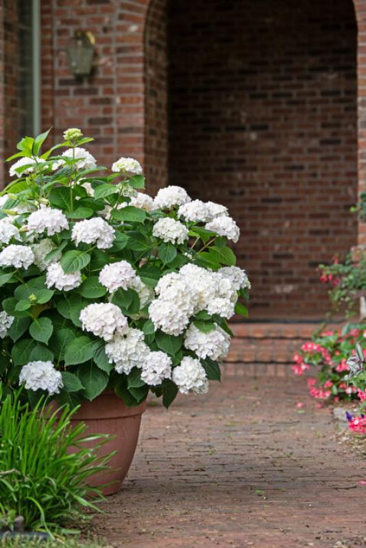 Just as the name suggests, Blushing Bride has pure white semi-double florets, which mature to blush pink or Carolina blue, depending on soil pH. Starting in late spring, Blushing Bride graces the garden with big round balls of soft blooms, providing an elegant touch of color in the garden all the way into fall. Long a favorite of European gardeners, Blushing Bride can serve as a focal point or can be used in the garden to separate louder, harsher colors providing harmony and ease. The special joy of Blushing Bride is its adaptability both in your landscape and for cut hydrangea arrangements. With its gorgeous pure white hydrangea color, it is also a favorite for wedding bouquets, arrangements and hydrangea centerpieces.